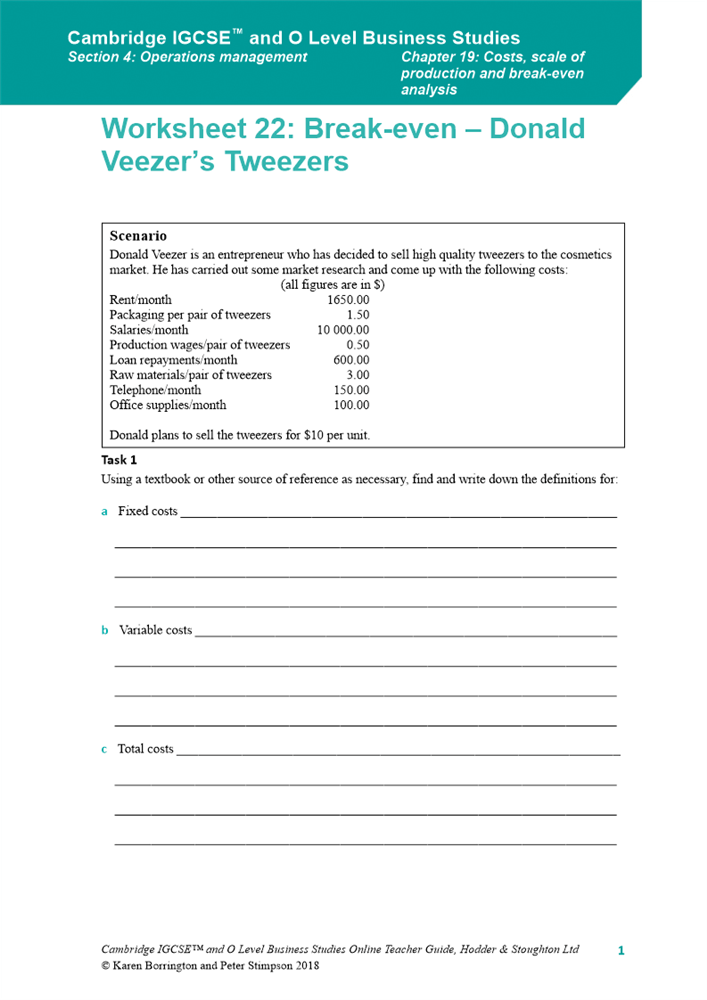The pastureland dairy makes cheese, which it sells at local supermarkets. ▷ student assessment worksheet with solutions. I have found these resources useful for introducing break even to reasonably low ability students… Browse break even analysis resources on teachers pay teachers,. Browse break even point resources on teachers pay teachers,. Simple worksheet which introduced the concept of breakeven, the terms fixed,variable and total costs, contribution, revenue and margin of . The 50,000 is a fixed cost or a cost that cannot change. The fixed monthly cost of production is $4,000 . The monthly fixed costs for its factory are £25 500. Crystal clear manufactures and sells greenhouses from its base in south yorkshire. Students can use the worksheet to follow along with the presentation . It costs a publishing company 50,000 dollars to make books. Determine students' prior knowledge of fundamental .